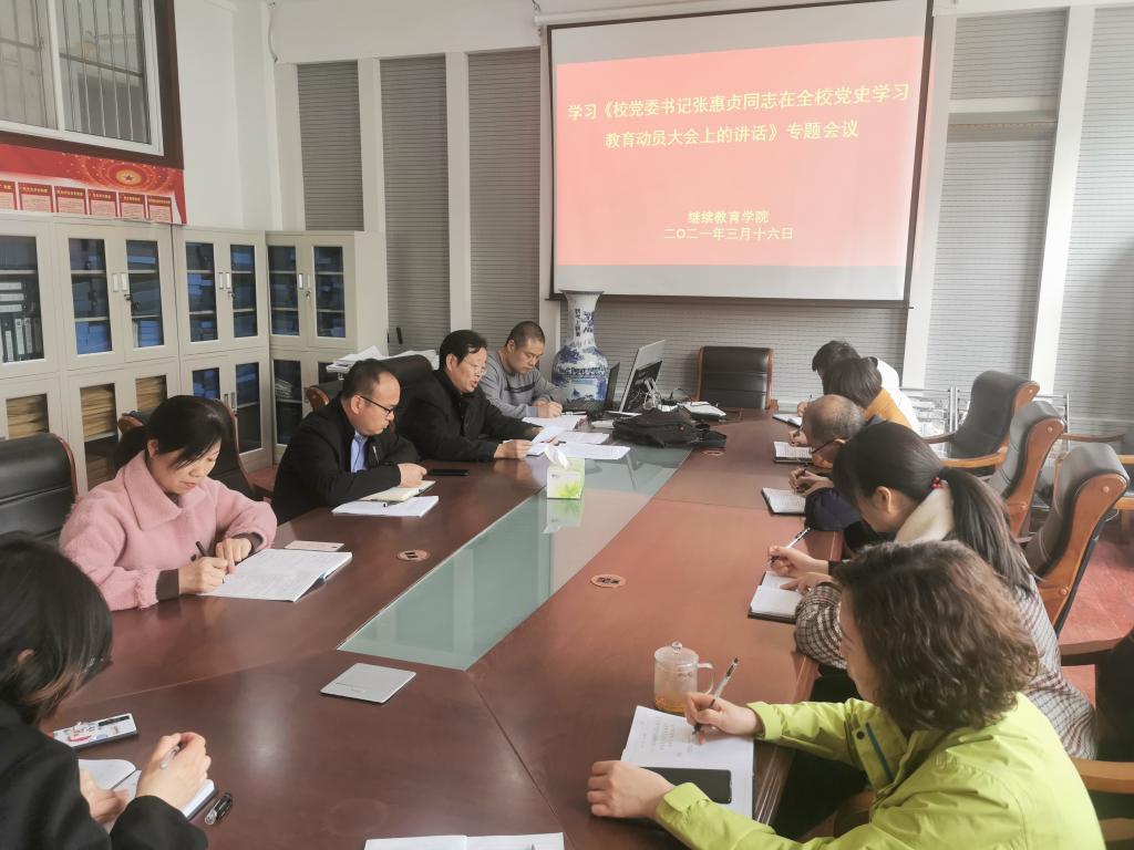 马照民传达了我校党史学习教育动员大会精神,并带领大家学习了校党委书记张惠贞同志在全校党史学习教育动员大会上的讲话。他指出今年是中国共产党成立100周年,在全党开展党史学习教育意义重大。并就开展好全院党史学习教育,马照民提出四点要求。一是深刻理解党史学习教育的重大意义。开展党史学习教育,是牢记初心使命、推进中华民族伟大复兴历史伟业的必然要求。二是认清党史学习教育的目标要求和重点内容。要深刻铭记中国共产党百年奋斗的光辉历程,要深刻认识中国共产党为国家和民族作出的伟大贡献,要深刻感悟中国共产党始终不渝为人民的初心宗旨。三是强化党史学习教育的实效。要与高校成人教育工作结合起来,要与学院青年教师队伍建设结合起来,要与成人教育意识形态建设结合起来。四是创新党史学习教育的方式方法,要注重领导带学,要注重个人自学,要注重集体研学,要注重学习督导,要注重实践检学。最后他要求全体党员要进一步把思想和行动统一到党中央、省委、市委和校党委的决策部署上来,扎实开展好党史学习教育。