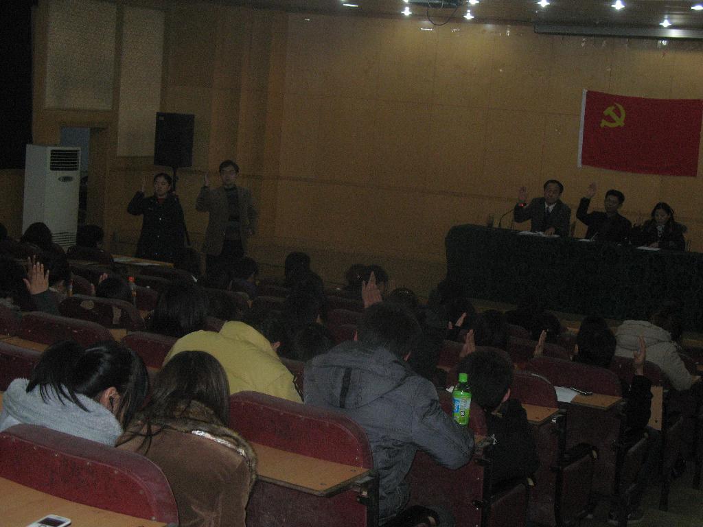 大会上,发展对象依次宣读了入党志愿书,转正对象汇报了自己在预备期的现实表现情况,并提出了转正申请,入党介绍人分别向大会汇报了发展对象和转正对象的培养情况,经过支部审议、大会充分讨论,参会正式党员通过表决,一致同意接收胡玲玲等18名同学为预备党员,一致同意徐萌萌等14名预备党员按期转为正式党员。