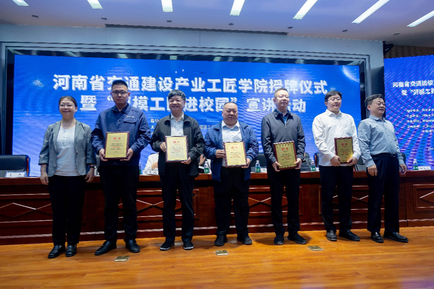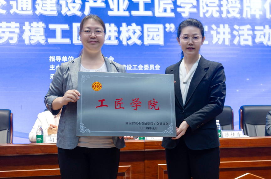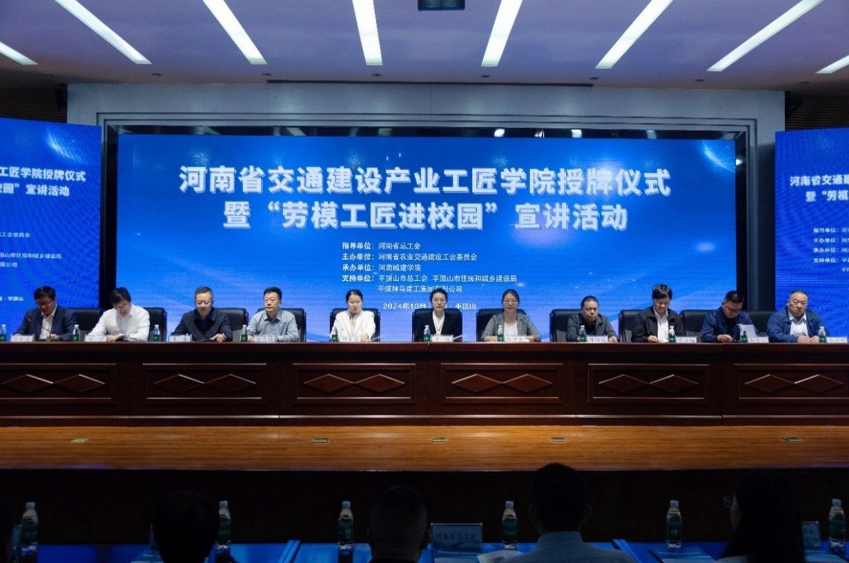 10月15日,由河南省农业交通建设工会委员会主办,我校承办的河南省交通建设产业工匠学院授牌仪式暨“劳模工匠进校园”宣讲活动在我校成功举行。校长陈桂香,河南省总工会副主席、党组成员黄健,河南省农业交通建设工会副主席胡长瑞,平顶山市总工会党组书记、副主席林胜国,河南省住房和城乡建设厅市场监管处副处长张贵鹏,平顶山市住房和城乡建设局党组成员、副局长王赓,河南新城建设有限公司党总支书记李江福,中原环保股份有限公司马头岗水务分公司副总经理和笑天,河南交投集团中天公司智慧研究院负责人张会欣,平煤神马建工集团有限公司党委副书记、总经理刘升等领导和嘉宾出席开幕式,我校师生代表400余人参加此次活动。仪式由副校长陈松涛主持。