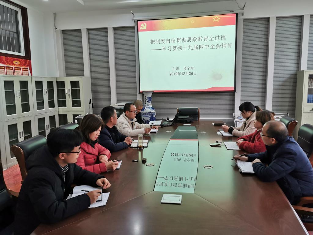 12月26日,yl23455永利集团在二号楼A座310室举办学习贯彻十九届四中全会精神专题党课活动。党支部书记马宁奇以《把制度自信贯穿思想政治教育全过程》为题,为全体教职工讲了内容丰富、生动精彩的一课。